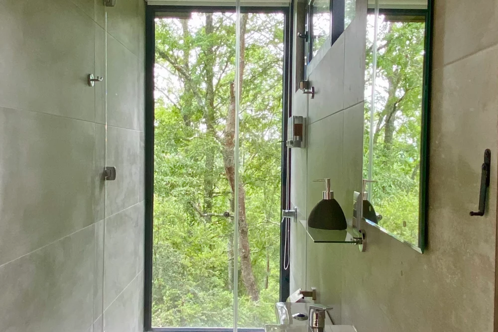The covered entrance way leads you into the cabin, where you will find a cozy fireplace, complimentary Wi-Fi, complimentary breakfast, and a fully stocked kitchen and bar service, all adding to the luxury and comfort of this cabin, making it a profoundly special experience.